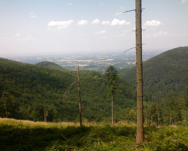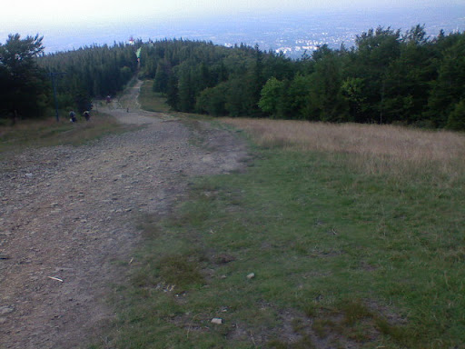 Po odpoczynku i podziwianiu wspaniałych widoków rozciągających się ze szczytu Szyndzielni, czekał mnie największy w życiu zjazd. Zjeżdżałem powoli nartostradą (czerwony szlak turystyczny) na Dębowiec. Zjazd momentami robi się stromy. Robiłem też postoje, aby ochłodzić moje klocki hamulcowe i obręcze (były tak ciepłe, że nie możnabyło ich dotknąć). W końcu dojechałem na Dębowiec, a stamtąd na ul.Armii Krajowej w Bielsku-Białej.